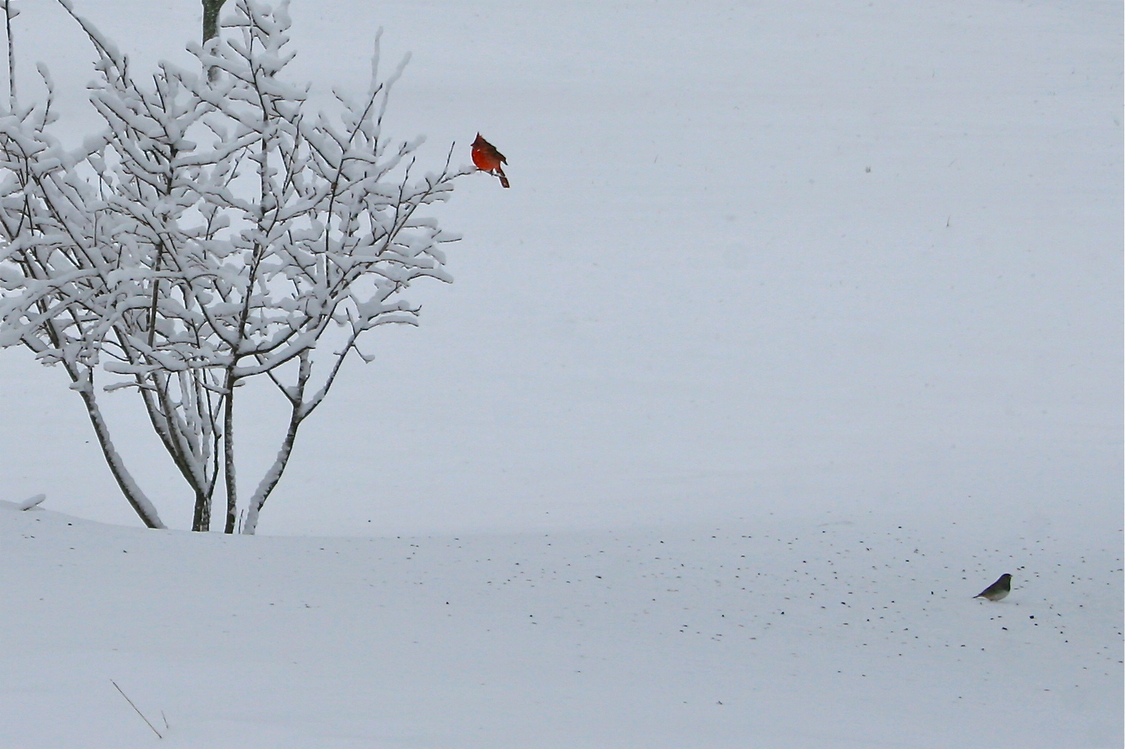 Birds waiting their turn to devour the seed in our feeders during one of last winter's snow storms.
